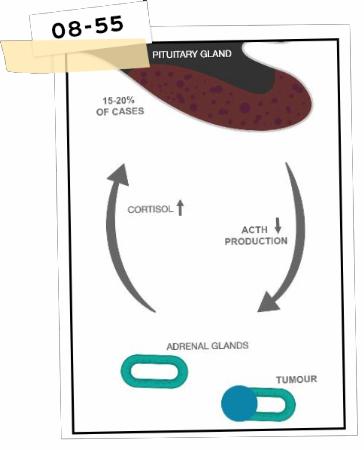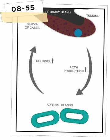 Cellerne i denne tumor producerer for store mængder ACTH, hvilket igen fører til en uforholdsmæssigt stor produktion af kortisol.